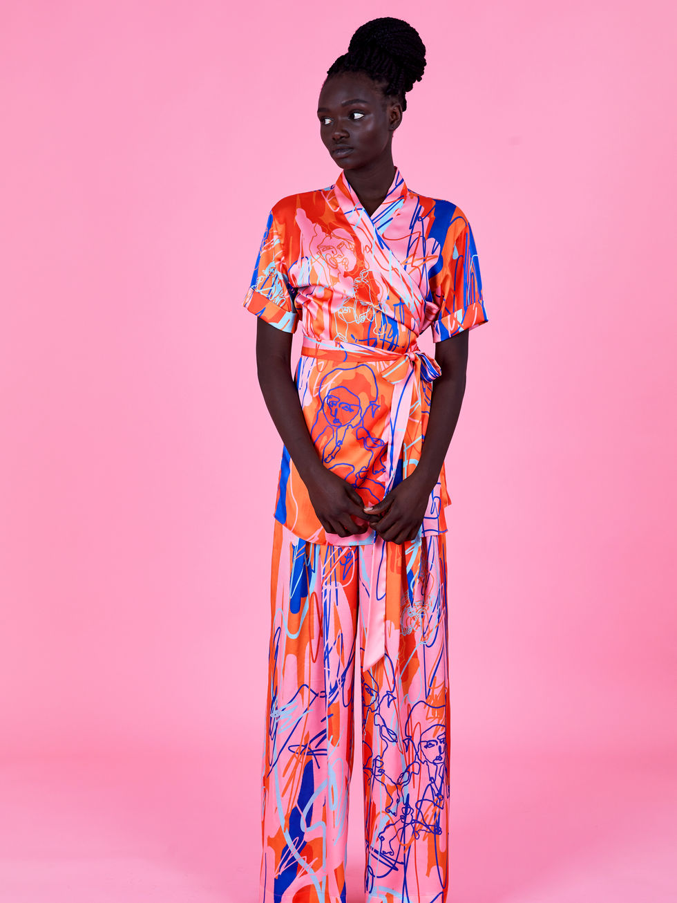 A printed two-part Satin suit, made of a criss-cross top with a tie detail, a thin waisted wide-leg pants with crease details on the sides. The suit has a print of a drawing specially made by Shachar for this piece that exists in two color schemes: a colored orange and blue scheme and a black and white one. Both pieces of this suit can be purchased separately. The cut of the top makes it adjustable to many body types, pants have an elastic band on the back and comes in two sizes S+M+L = 36+38+40 or XL+XXL+ XXXL = 42+44+46. It suites businesswomen who like being elegant, young and spritely.