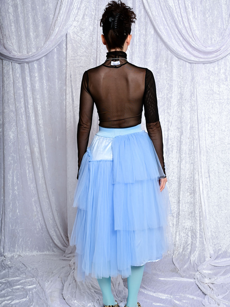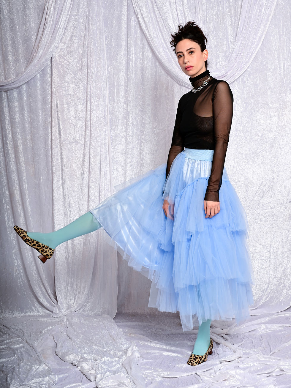 A cool shirt with many translucent layers which are cut in fun ways. The top's layers create a game of sheerness and opaqueness. The shirt is ONE SIZE that fits sizes 34-44.