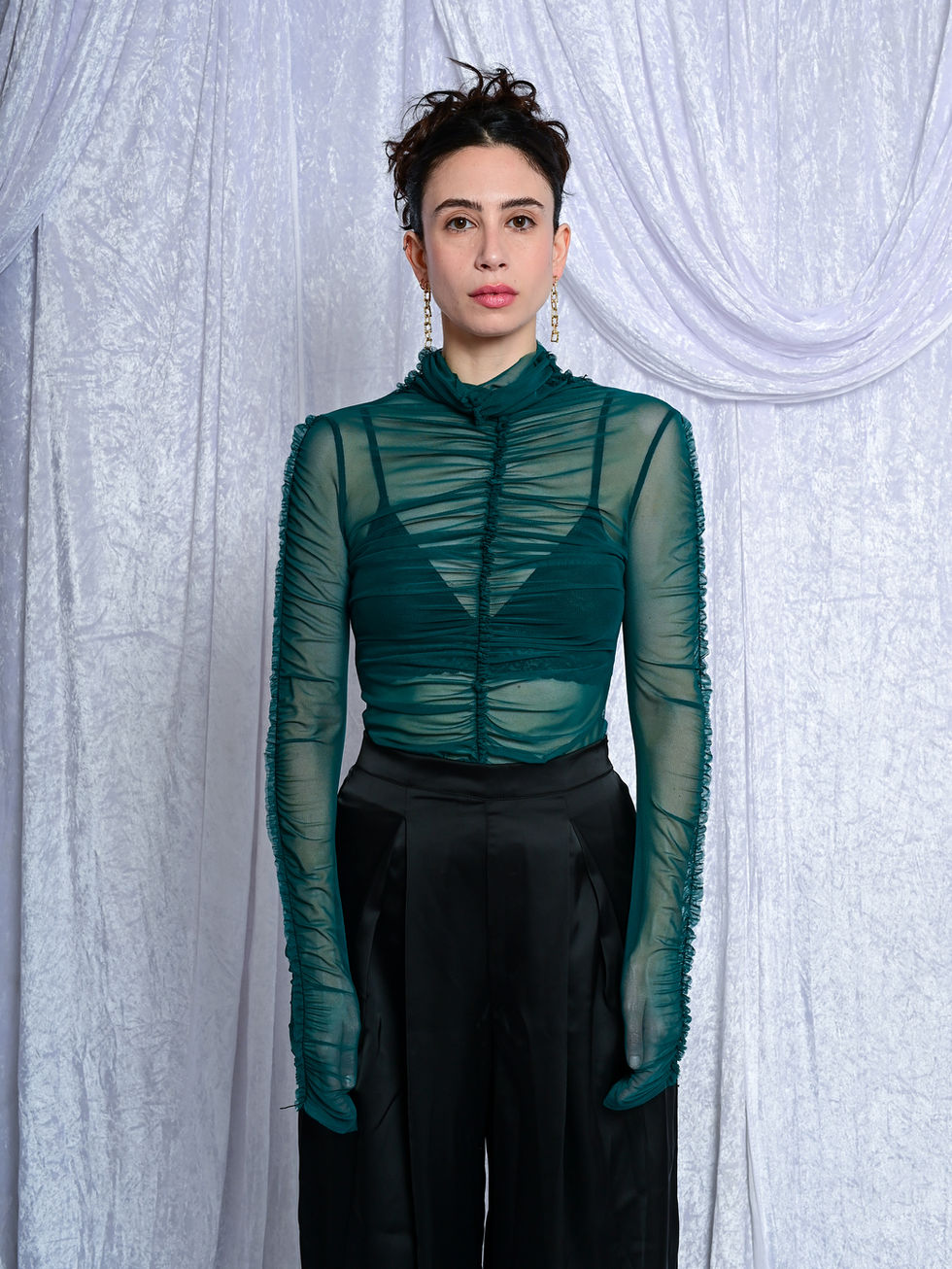 A light and fun sheer turtleneck top with a central gathering on the front and on the sleeves. The top's gatherings are sewn with a black elastic thread that allows free and comfortable movement. This top comes in sizes:S-M=34-38, L-XL=40-44.