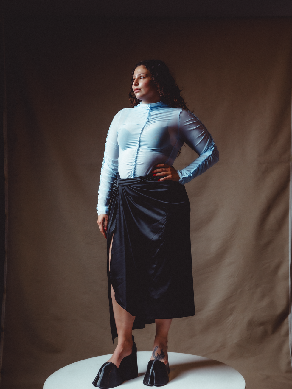 A light and fun sheer turtleneck top with a central gathering on the front and on the sleeves. The top's gatherings are sewn with a black elastic thread that allows free and comfortable movement. This top comes in sizes:S-M=34-38, L-XL=40-44.
