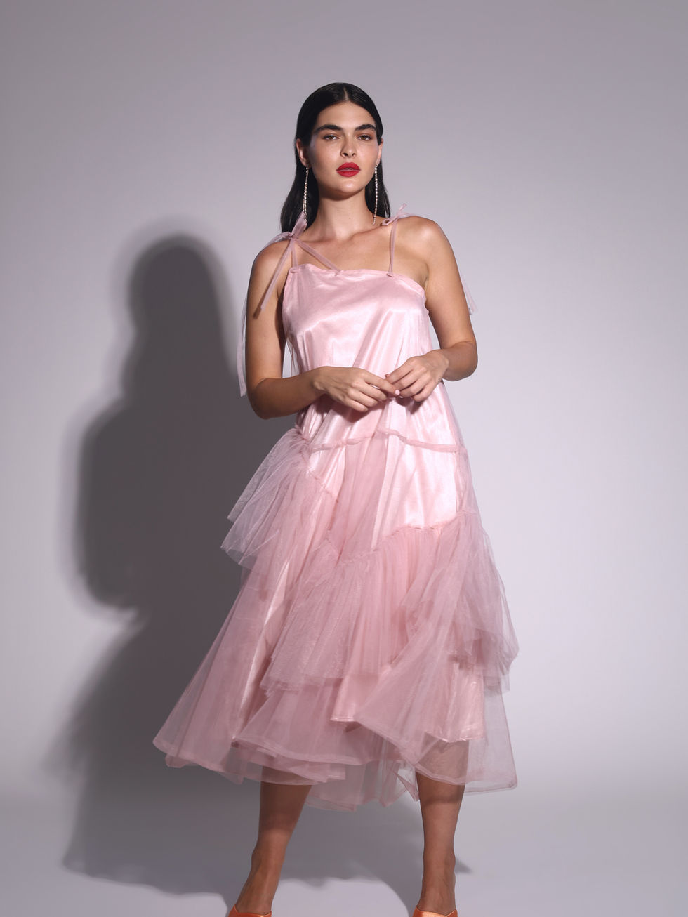 A wide, airy, translucent Tulle dress with tied adjustable straps and dynamic diagonal gatherings. The perfect dress for a light yet dominant look.