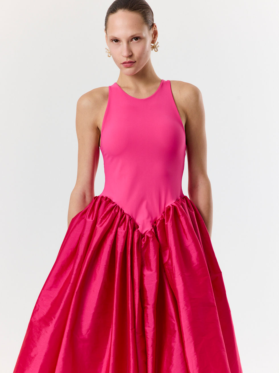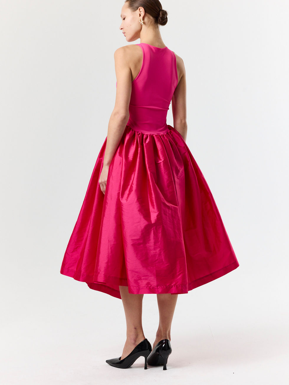 A delicate V-shaped seam at the waistline accentuates the natural curves, creating a flattering transition between the sleek upper body and the sculptural lower form. The sleeveless cut highlights the shoulders with understated confidence, while the midi length lends an air of timeless sophistication.