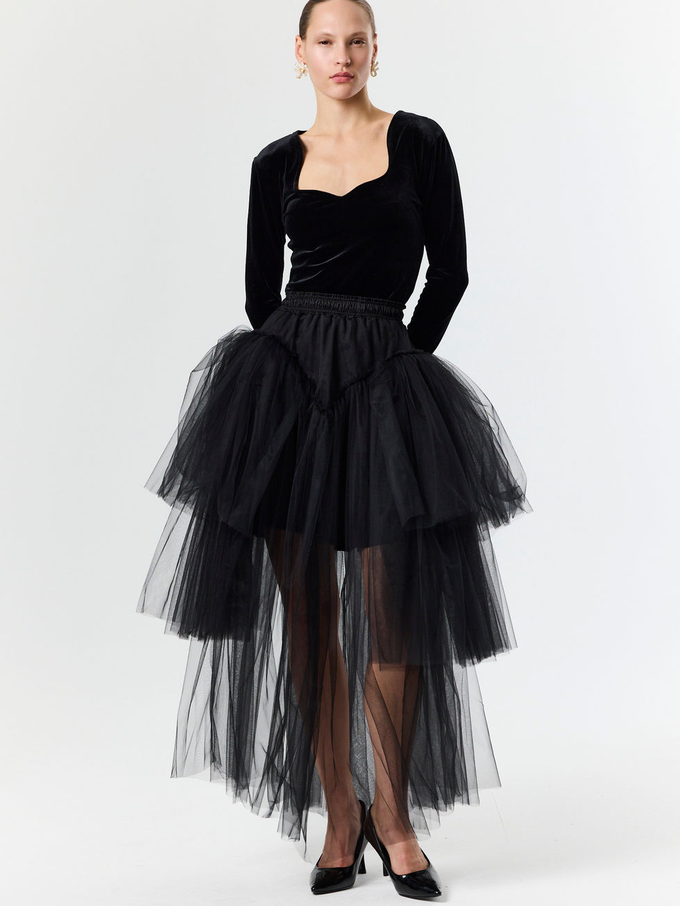 A refined turtleneck frames the neckline with effortless grace, while delicate bow details at the shoulders add a whimsical, feminine touch. The long sleeves elongate the figure, balancing the top’s sculptural form with fluid sophistication.