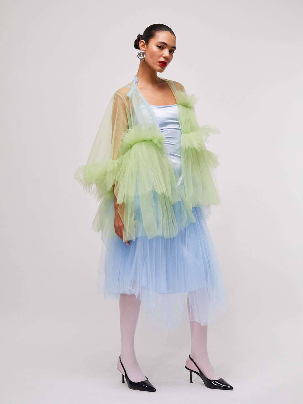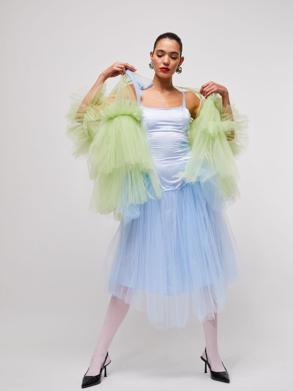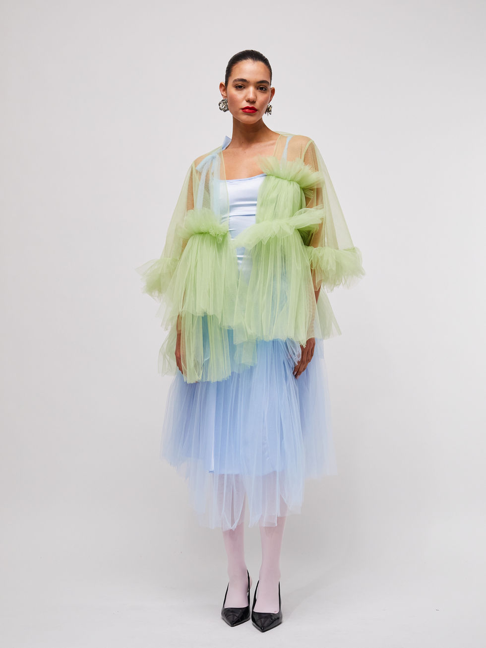 A soft tulle Jacket with bell sleeves. Goes perfectly over dresses; shirts and basically anything.