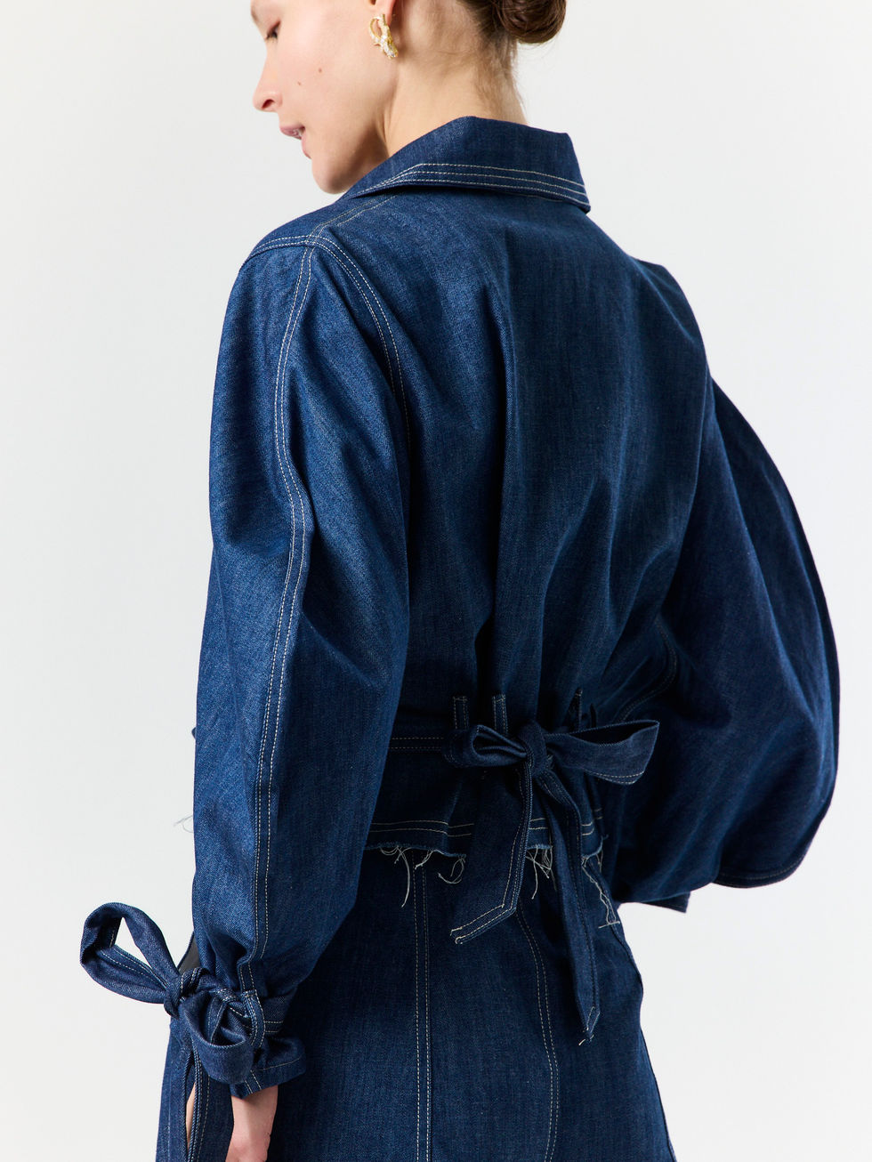 Delicate tie straps at the waist and cuffs allow for a customizable silhouette — cinch it close for a sculpted, hourglass shape or leave it loose for a relaxed, modern drape. Every detail, from the textured seams to the soft, lived-in finish, evokes an air of understated sophistication.